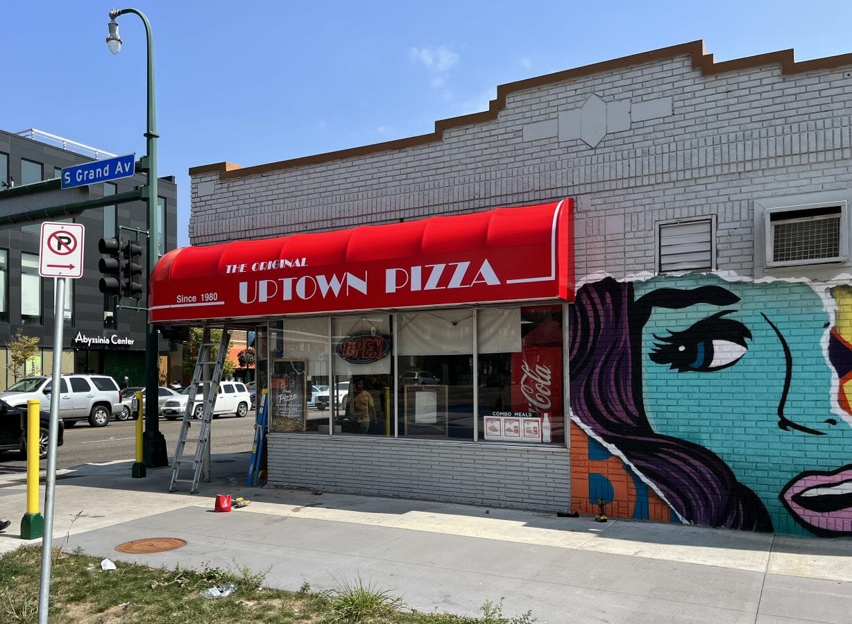 Uptown Pizza has been a staple in Minneapolis since 1980. Located at the corner of West Lake Street and Grand Avenue South, the restaurant is highly visible at this busy intersection. Unfortunately, their awning had seen better days. Awning material is manufactured to be durable and long-lasting, but given enough time it will eventually start to break down. Sunlight, snow, wind and ice all take their toll. The previous awning was so deteriorated that entire sections were missing from the frame, as seen in the below left-hand photos.