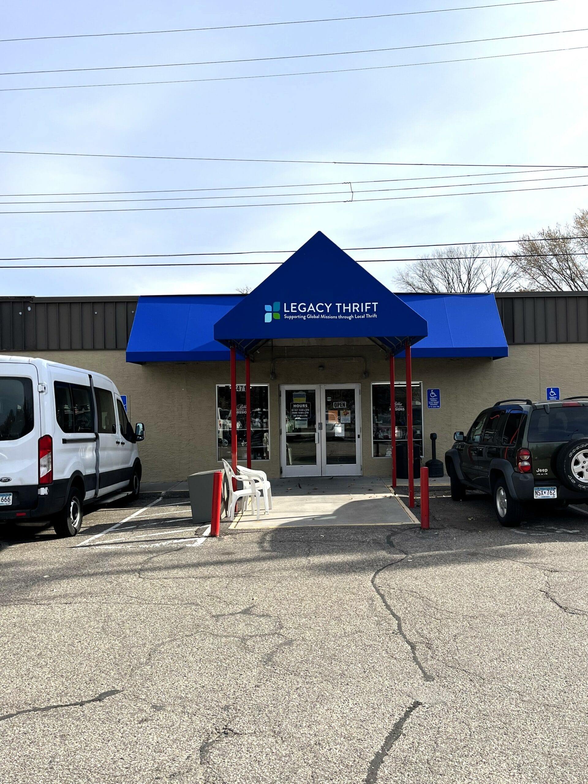 Acme Awning manufactures custom awnings at their Minneapolis location, which allows for an expert level of customization and personalization. When Bibles for Missions rebranded in 2023 to its current name — Legacy Thrift — the Crystal, MN location needed to update their entrance canopy. They also wanted to freshen up the overall look of their building. Instead of just getting a new cover for their existing canopy, they contacted Acme Awning to see what could be done to update the look while using the existing supports.